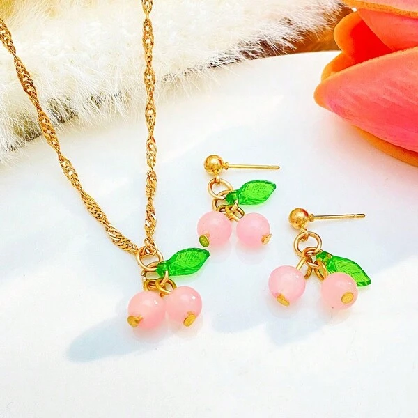 3pcs/Set Fashionable Cherry Red Necklace & Earrings Jewelry Set With Light Luxury, Niche Design Green & Pink Pendant Collarbone Chain, Exquisite Accessories For Women