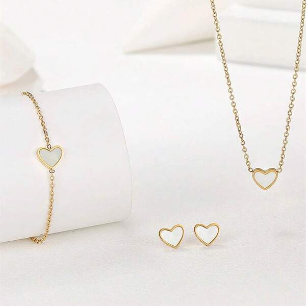 3pcs/Set Heart Shaped French Style Shell Design Exquisite Women'S Jewelry Set, Including Necklace, Bracelet And Earrings