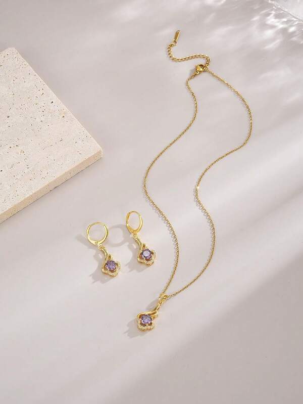 3pcs/Set Purple Cubic Zirconia Teardrop Shaped Pendant Necklace And Earrings For Women, Stainless Steel Material