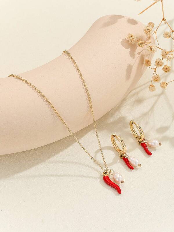 3pcs/Set Valentine's Day 14k Plated Stainless Steel Pearl Red Chili Pendant Necklace Earrings For Women, Ideal For Dating Gifts