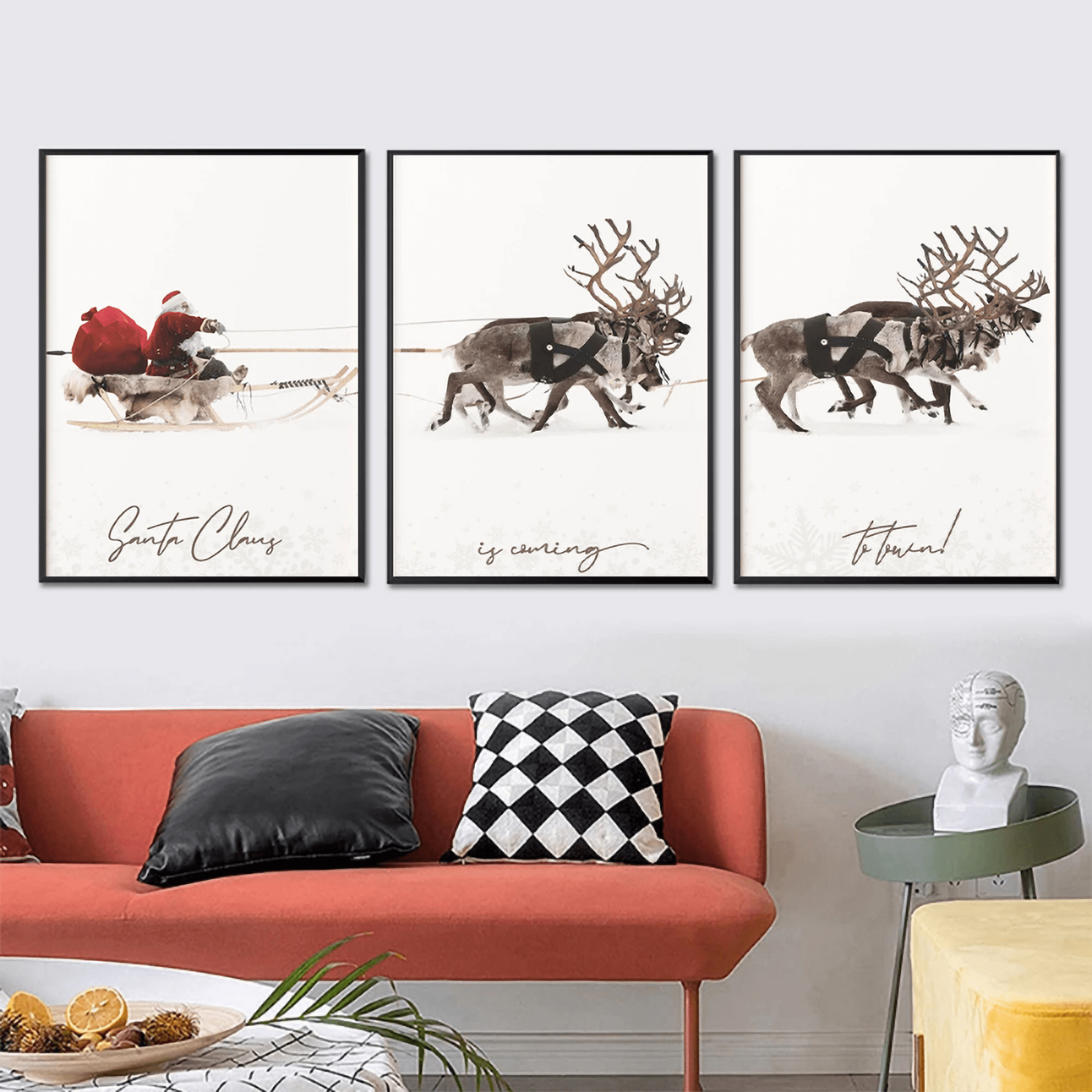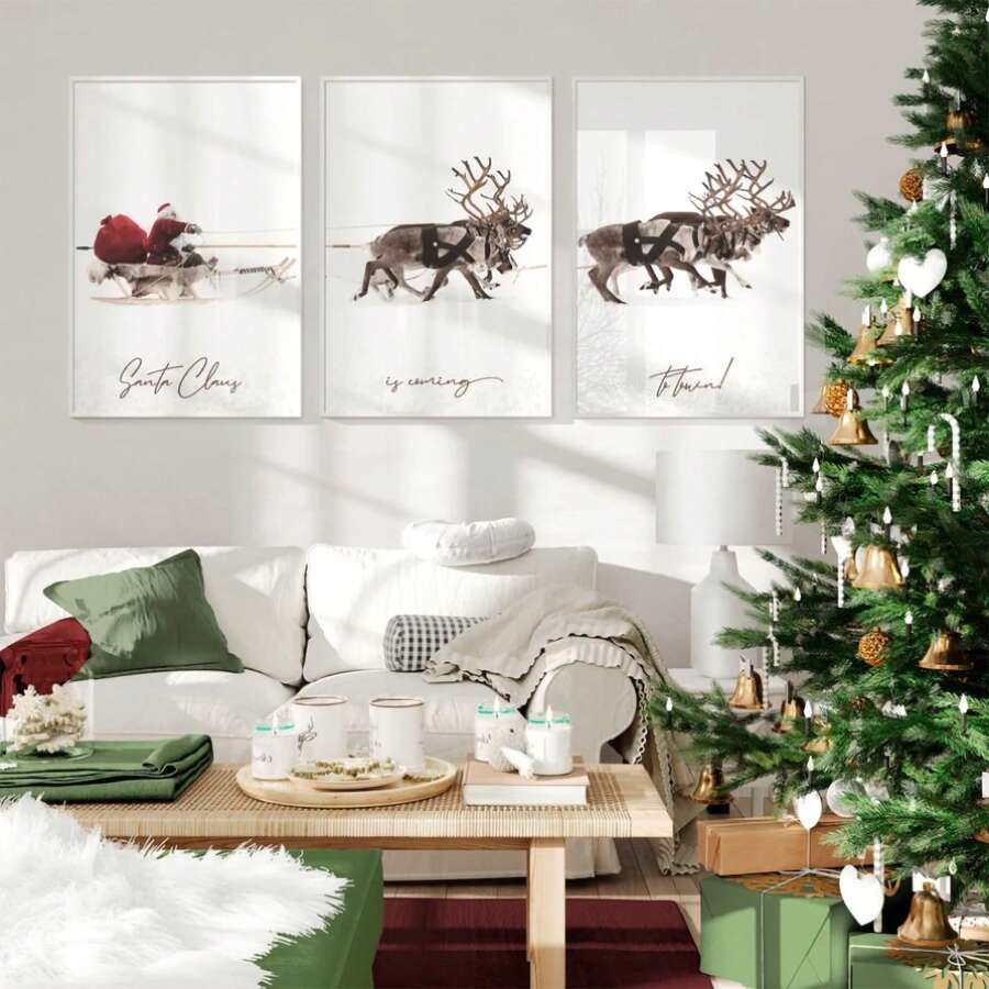 3pcs/set Christmas Elk Sled Santa Claus Frameless Door Wall Art Abstract Canvas Painting Art Poster Print Luxury Style Minimalist Modern Wall Picture for Living Room Bedroom Home Decoration