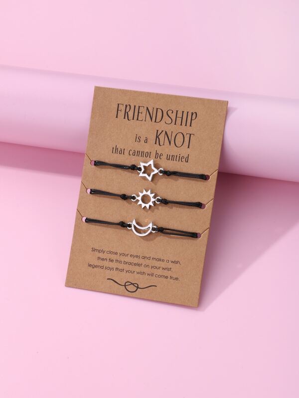 3pcs/set Cute Zinc Alloy Sun, Moon, & Star Shaped Black Wax Cord Braided Bracelets For Girls, Suitable For Daily Wear
