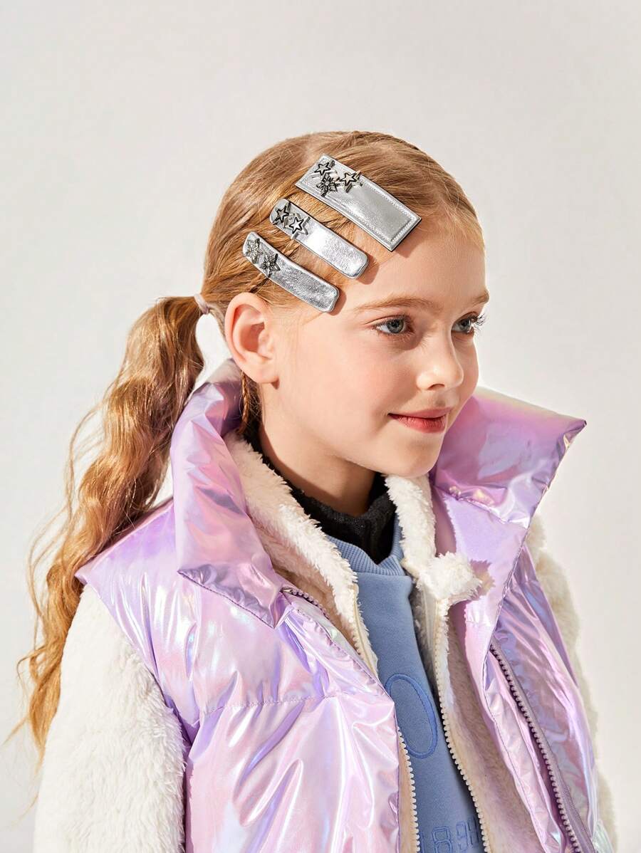 3pcs/set Fashionable Cool Girls' Silver Pu Leather Star Hair Clip Set For Street Style, Daily Wear, Photography, And Travel