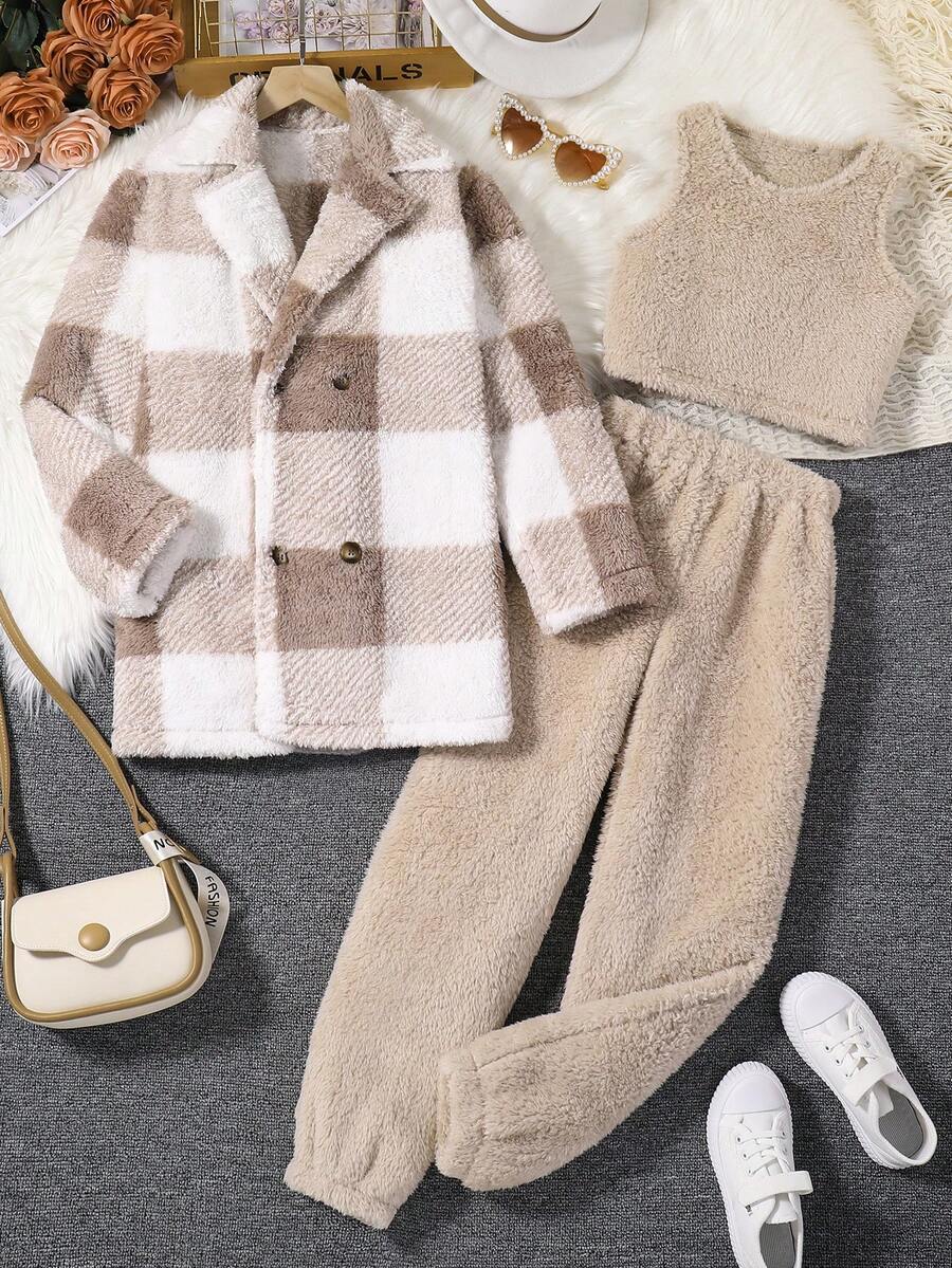 SHEIN Kids EVRYDAY 3pcs/set Plaid Fleece Jacket, Short Vest And Long Pants For Teenage Girls