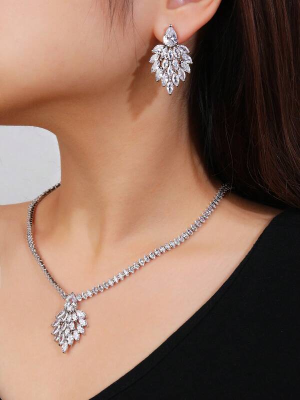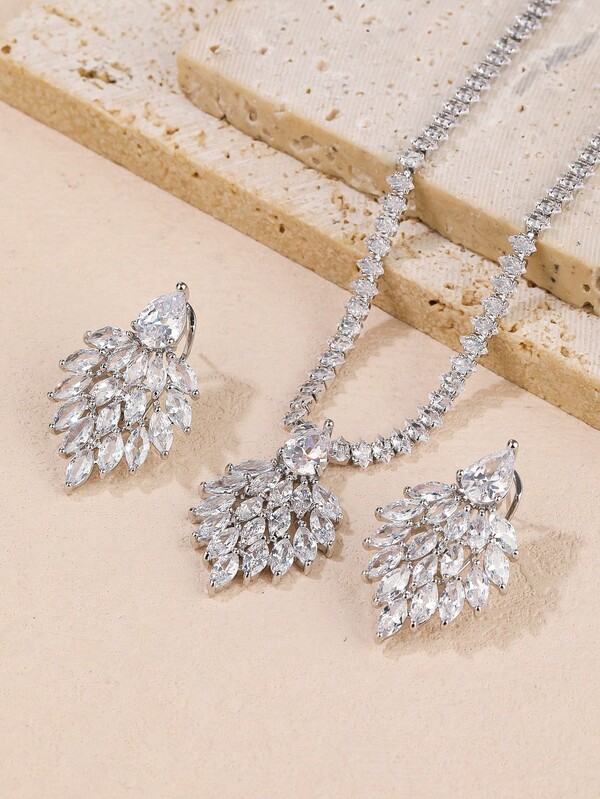 3pieces/Set Fashionable Feather Shaped Cubic Zirconia Necklace & Earrings Set For Wedding Party Dress Up