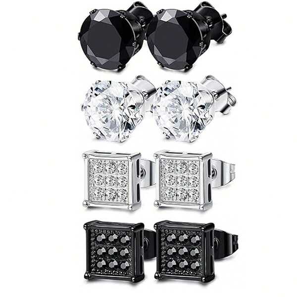 4 Pairs Stainless Steel Stud Earrings For Men Women Black Square Stud Earrings Set Mens Earrings Inlaid Cubic Zirconia 6MM Hypoallergenic