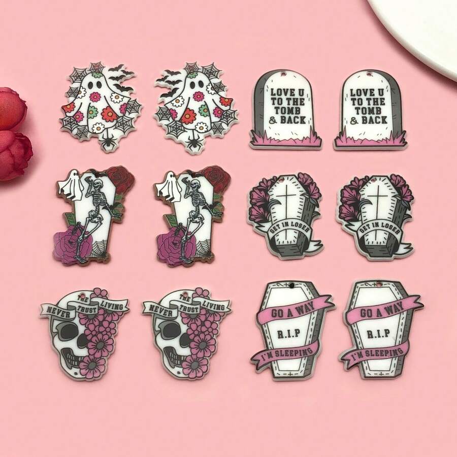 4/12 Pcs Acrylic Double-Sided Printed Ghost Skull Tombstone Charms – Halloween DIY Craft Accessories For Handmade Earrings, Bracelets, Necklaces, Keychains & Bag Decor