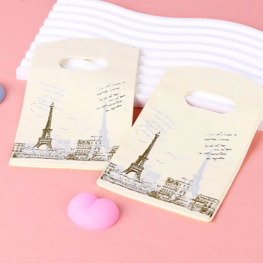 45pcs/Set Mini Plastic Gift Bags With Handle, Beige Color Eiffel Tower Printed, Perfect For Party And Jewelry Shop