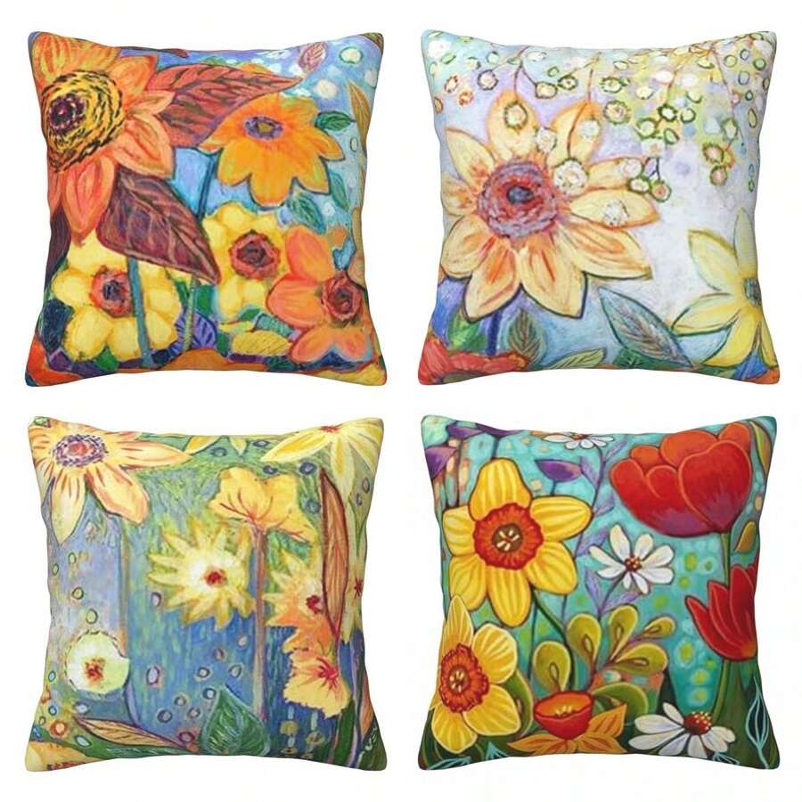 4PCS Ink Oil Painting Watercolor Flowers Buds Decorative Throw Pillow Cover Case Home Living Room Bed Sofa Car Linen Square 18 X 18 Inches