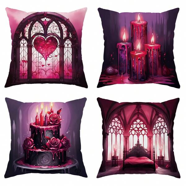 4Pcs Valentine'S Day Candle Cake Room Heart Red Purple Throw Pillow Covers, Valentine'S Day Gothic Throw Pillow Covers, Velvet Decorative Cushion Cover 45*45Cm/18"*18" For Valentine'S Day Party Living Room Bedroom Sofa Bed Decoration Gift