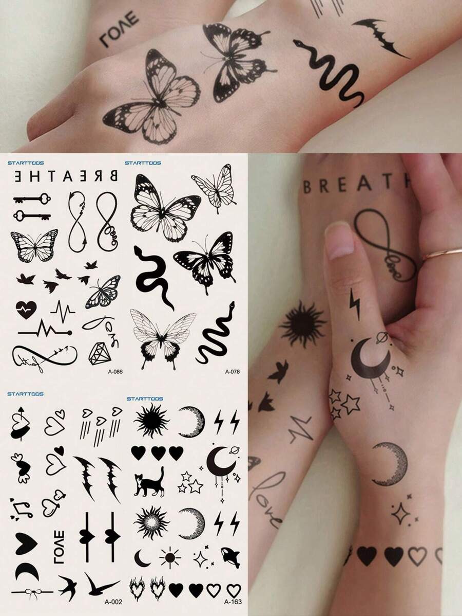 4pcs Black Butterfly, Crescent, Heart, Snake Design Temporary Tattoo Stickers For Fingers, Wrists Or Small Body Parts