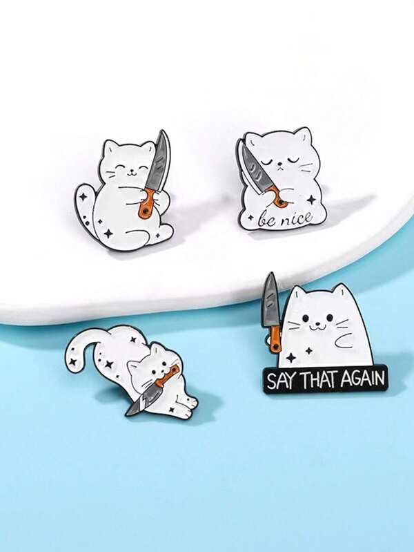 4pcs Cartoon Cat With Knife Funny Design Brooch Badge, Suitable As Gifts For Friends Or Children