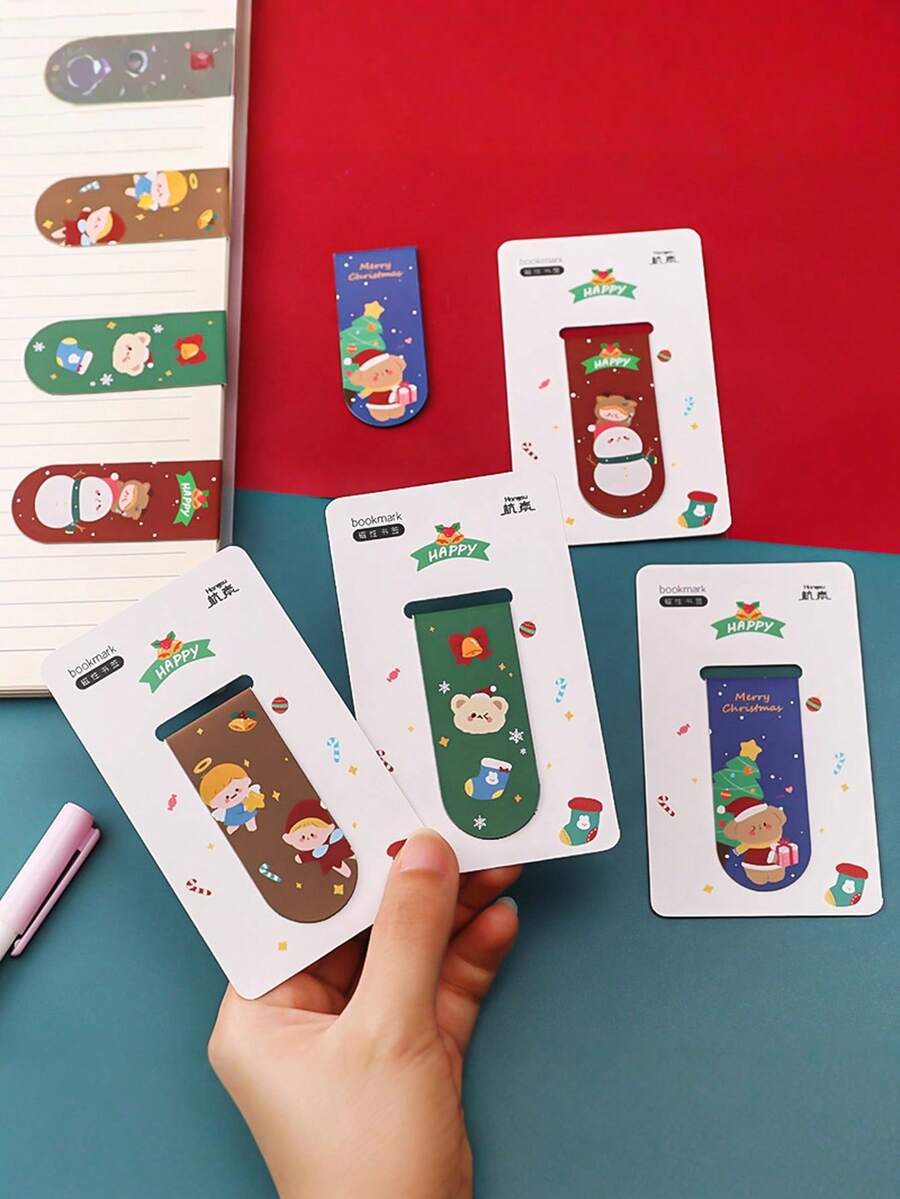 4pcs Cartoon Christmas Magnetic Bookmarks, Cute Girl Personalized Elegant Creative Bookmarks For Students, Double-Sided Paper Clip Magnetic Fridge Stickers