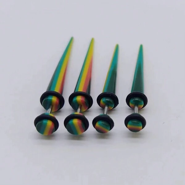 4pcs Fashionable Acrylic Ear Piercing Jewelry In Red, Green, & Yellow Color Combination: Stainless Steel Bar, Hypoallergenic, Fake Gauge Earrings With Flat, Round And Cone Shaped Studs (4mm-5mm)