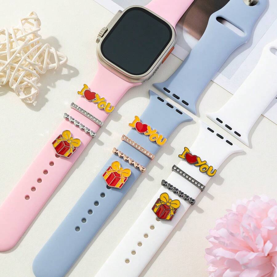 4pcs Gift Box Love Watchband Ring Loops Nails Studs, Cute Rhinestone Watch Strap Charms Decorations For Watchband