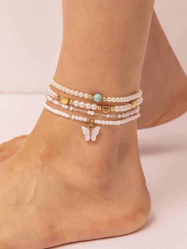 4pcs Girls Butterfly & Faux Pearl Decor Anklet For Daily Decoration