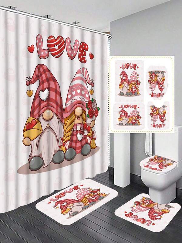 4pcs Valentine'S Day Inspired Heart Pattern Printed Bath Curtain Set Including Shower Curtain, Bath Mat, Toilet Cover & Non-Slip Mat, Waterproof, With 12 Hooks
