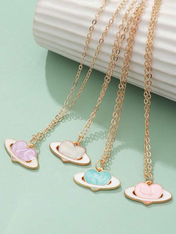 4pcs/Set Cute & Minimalist Design Oil Drip Peach Heart & Planet Necklace With Love Pendant For Girls' Daily Wear
