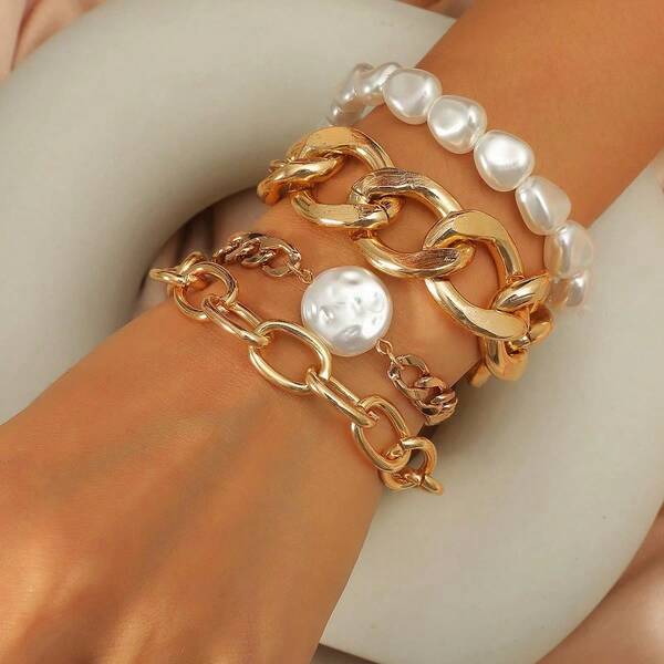 4pcs/Set European And American Minimalist Geometric Chunky Chain Design Hollow Out Bracelet For Women'S Fashionable And Personalized Hip Hop Style