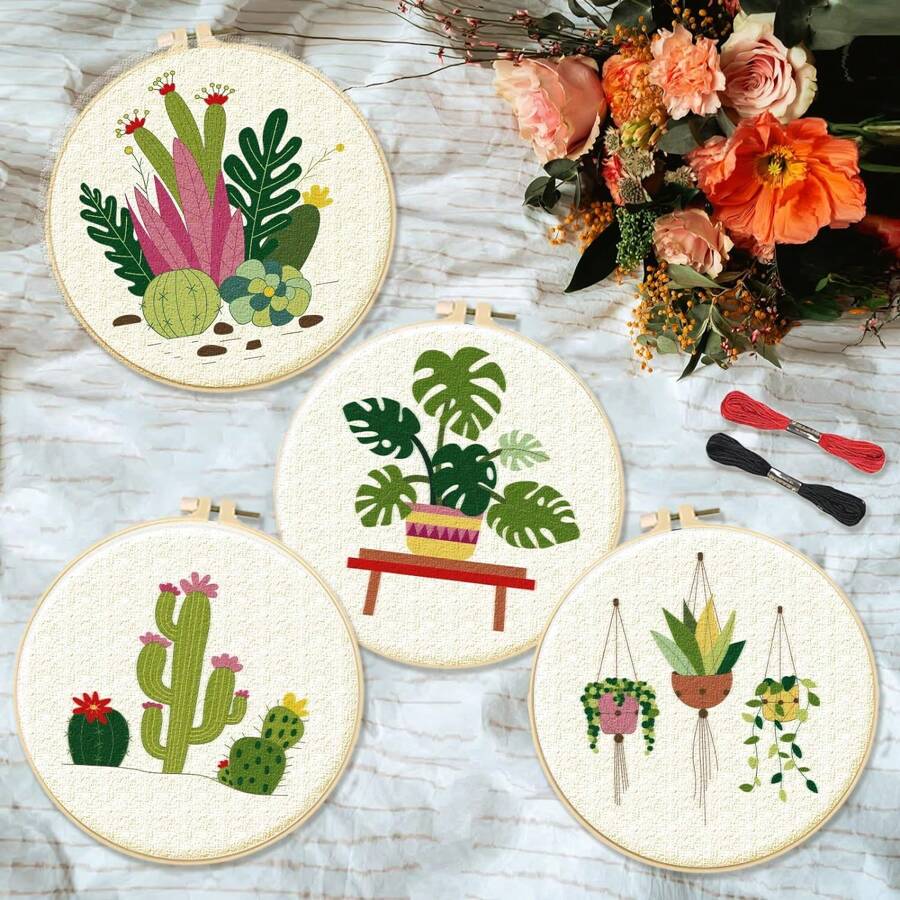 4pcs/Set Potted Plant Embroidery Kit Suitable For Beginners, Includes Cactus, Turtle Shell And Bamboo Patterns, With Printed Embroidery Cloth, Hoop, Thread, Needle And Instructions