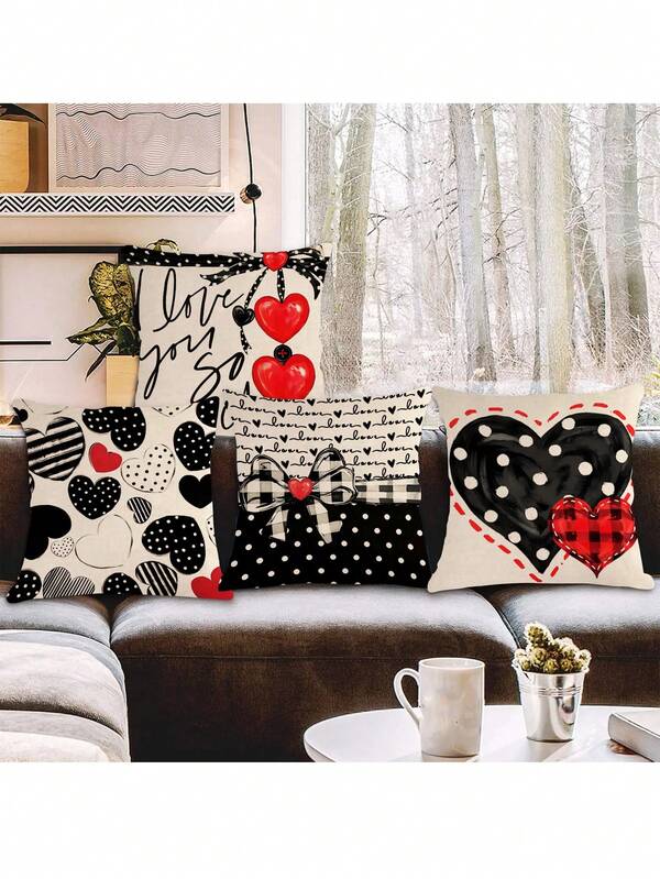 4pcs/Set Valentine'S Day Love Heart Black & White Simple Pattern Square Decorative Pillow Cover (Pillow Insert Not Included) For Home Sofa Decoration