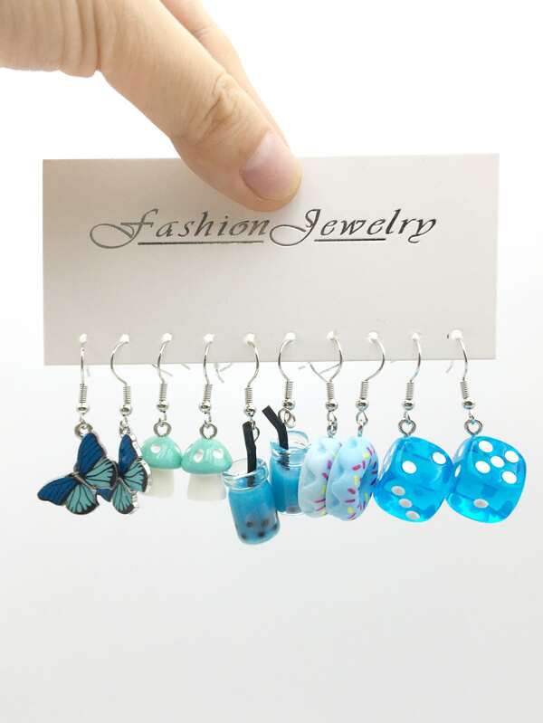 5 Pairs of Sweet Blue Fashion Acrylic Mushroom Milk Tea Cup & Butterfly Drop Charm Earrings For Daily Life Decoration Earrings