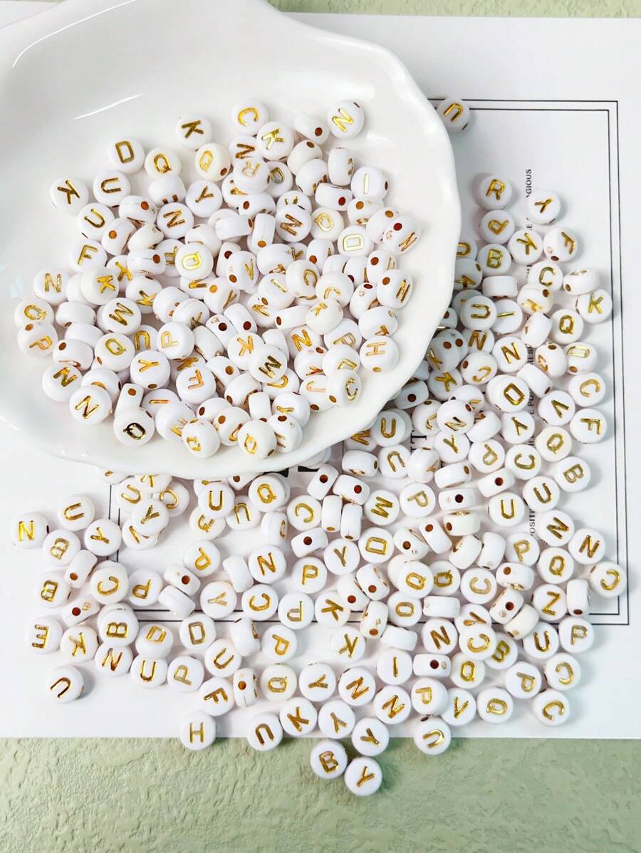 500pcs Acrylic Letter Beads: White Base With Gold Letter Alphabet Round & Flat Shape Beads With Hole For Diy Jewelry Making