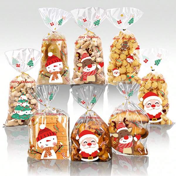 50pcs New Christmas Party Transparent Packaging Bags, Opp Flat Mouth Bags For Bakery, Snacks, Christmas Candy & Cookie Packaging, Santa Claus Gift Bags