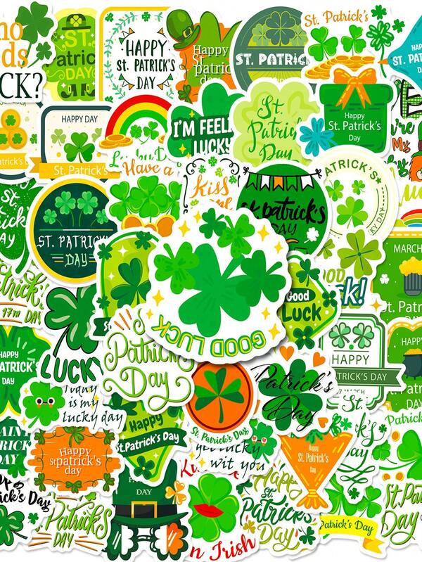 50pcs St. Patrick'S Day Green Lucky Clover Waterproof Decorative Stickers, St. Patrick'S Green Clover Blessing Stickers, For Decorate Household, Notebook, Computer, Mobile Phone, Water Cup, Skateboard, Office Stationery, Festival Gifts And Birthday Gifts