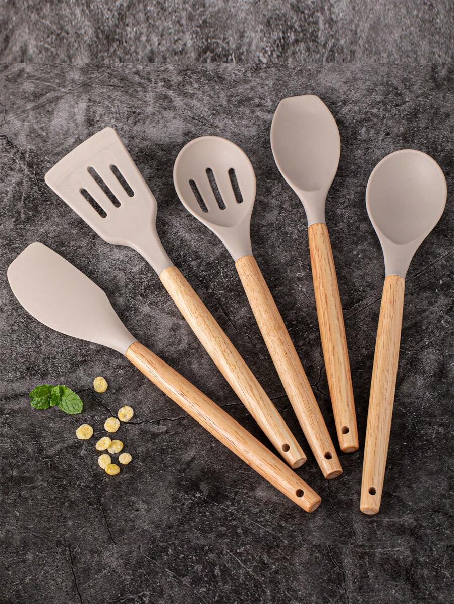 5Pcs Kitchen Accessories Tools Kitchenware Cocina Cookware Utensil Set Silicone Cooking Utensils With Natural Wooden Handles,5pcs In 1 Set Wooden Handle Kitchenware Non Stick Accessories Silicone Cooking Kitchen Utensil Set Tools With Holder Box,New Year Kitchen Tool,Red Color Silicone Utensil Set