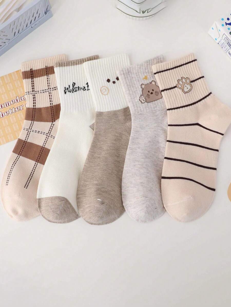 5pairs Women'S Cute Cartoon Pattern Mid-Calf Pile Socks