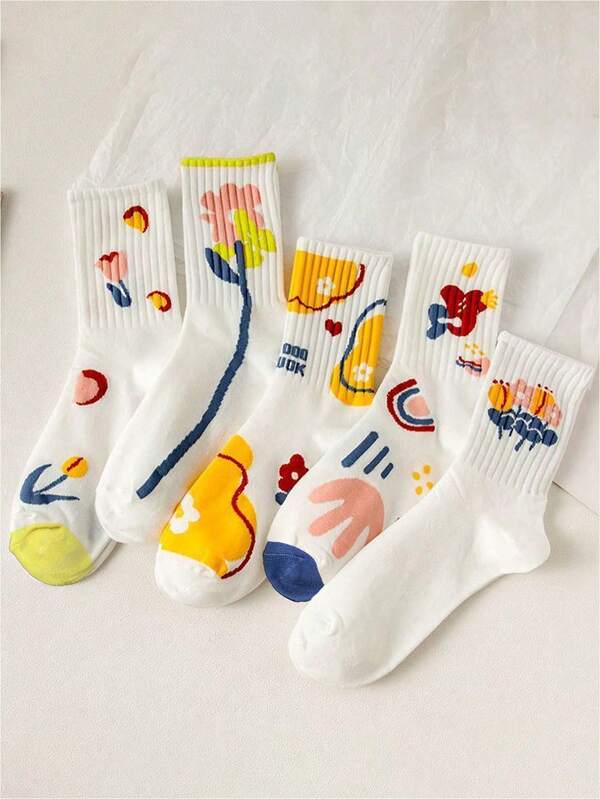 5pairs Women'S Ins Style Cartoon Graffiti & Flowers Pattern Mid-Calf Socks