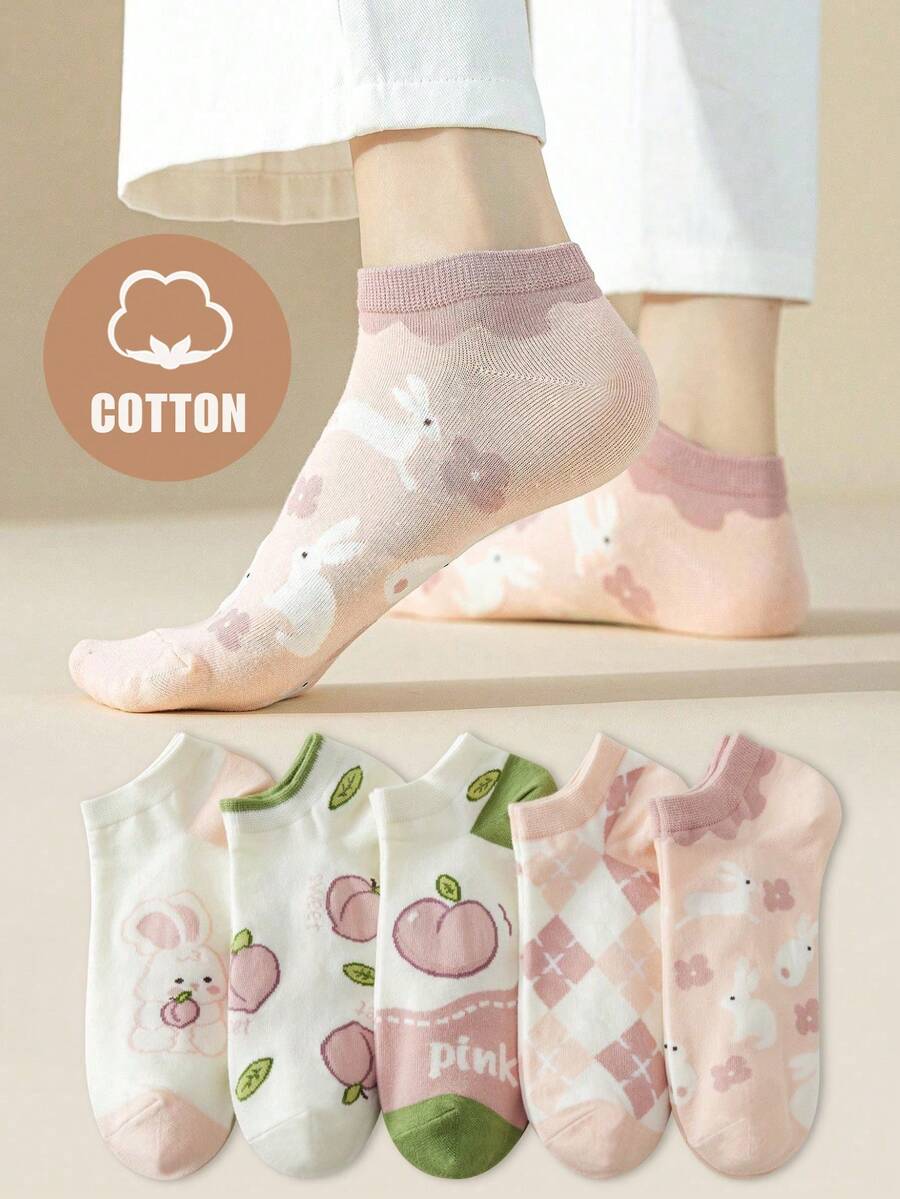 5pairs/Set Women'S Spring And Autumn Cartoon Cute Rabbit/Peach/Plaid Patterned Fashionable, Versatile, Comfortable And Breathable Short Socks In Pink Colors