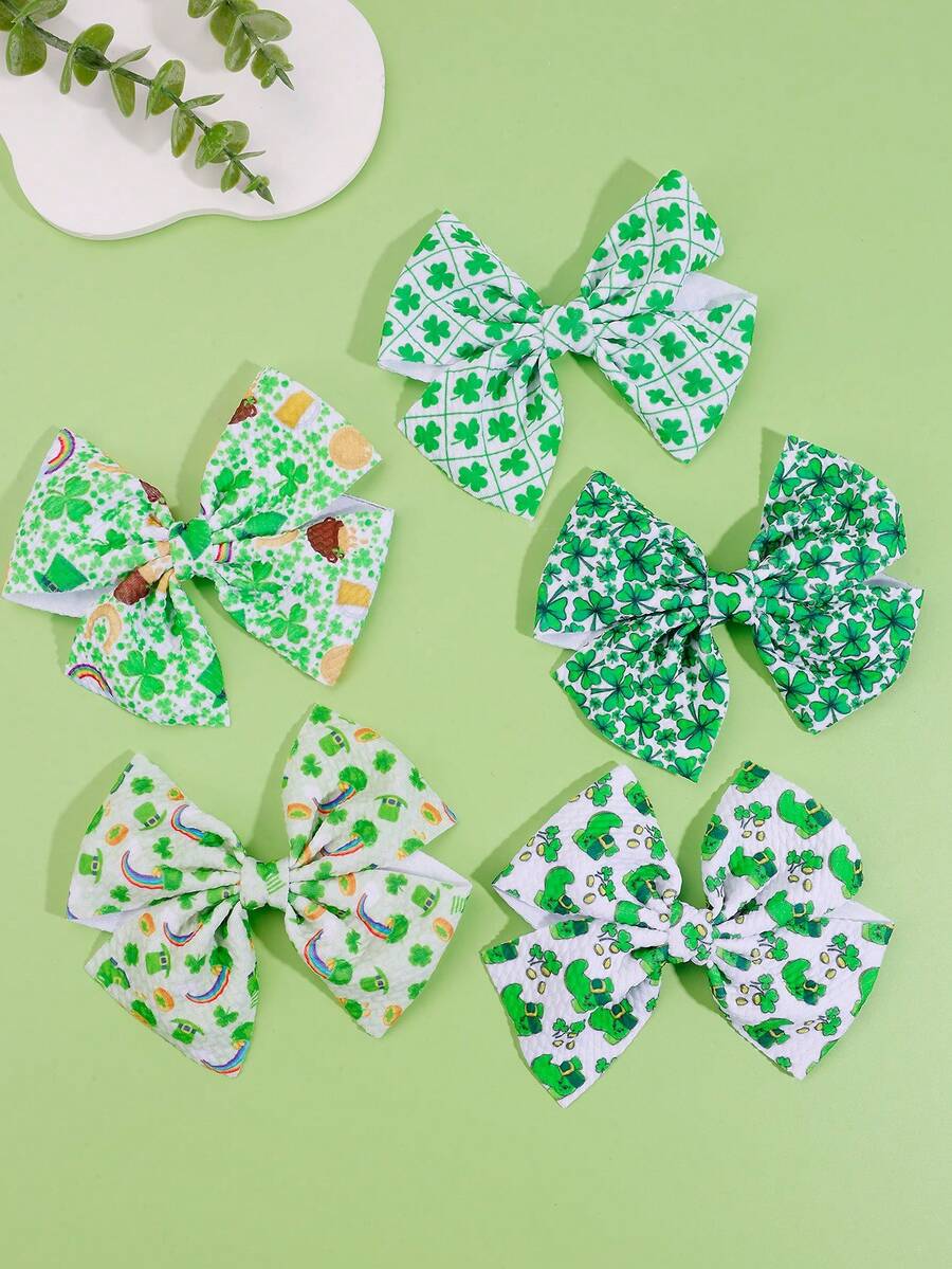 5pcs Children's Clover Hair Clips With Bowknot Design For Girls