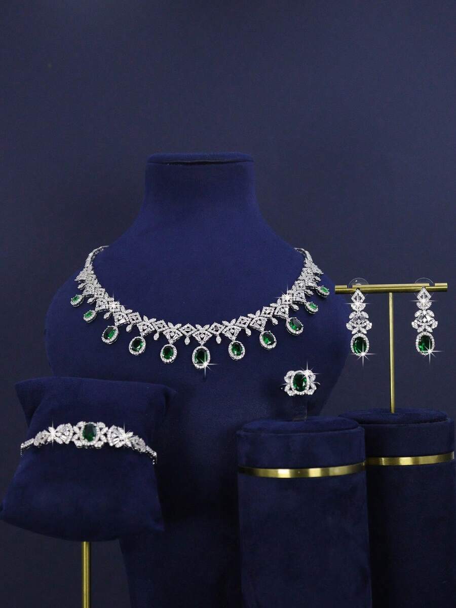 5pcs Luxury Royal Style Geometric Tassel Design Bridal Wedding Jewelry Set, Handset White Cubic Zirconia, Including Necklace, Bracelet, Earrings, Ring, Suitable For Daily Wedding Wear, Wedding Anniversary Gift (Comes In Gold Gift Box)