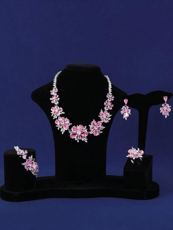 5pcs/Set Flower Decoration Cubic Zirconia Necklace/Earrings/Bracelet/Ring Jewelry Set Luxury Women Wedding Banquet Jewelry Set