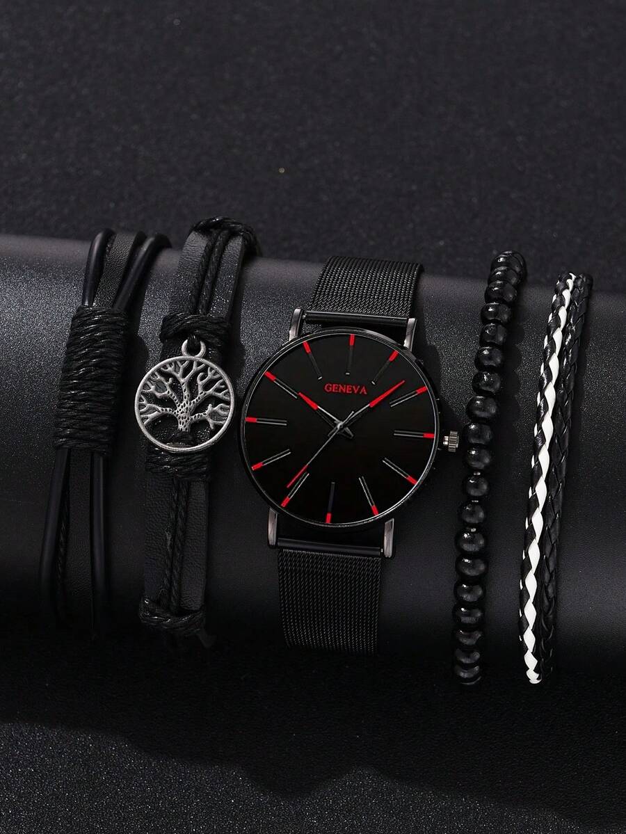 5pcs/Set Men'S Black Mesh Strap Watch + Classic & Fashionable Red Minimalist Dial Quartz Watch + Leather Bracelet, Suitable For Daily Wear And Decor, Gift Giving