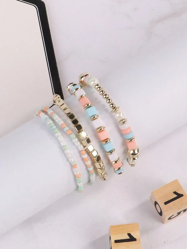 5pcs/Set Multilayer Adjustable Beaded Bracelet In Bohemian Style Handmade Jewelry