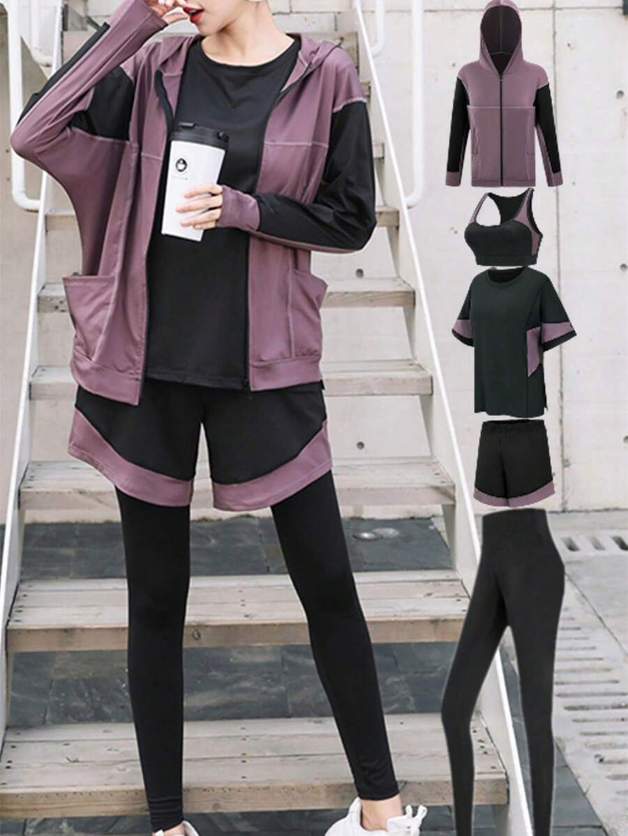 5pcs/set College Style Yoga Clothing Outdoor Gym Jogging Sunscreen Sports Suit With Long Sleeve & Pants