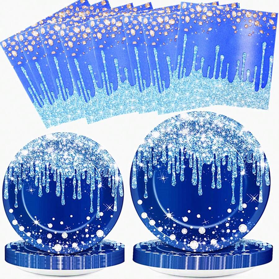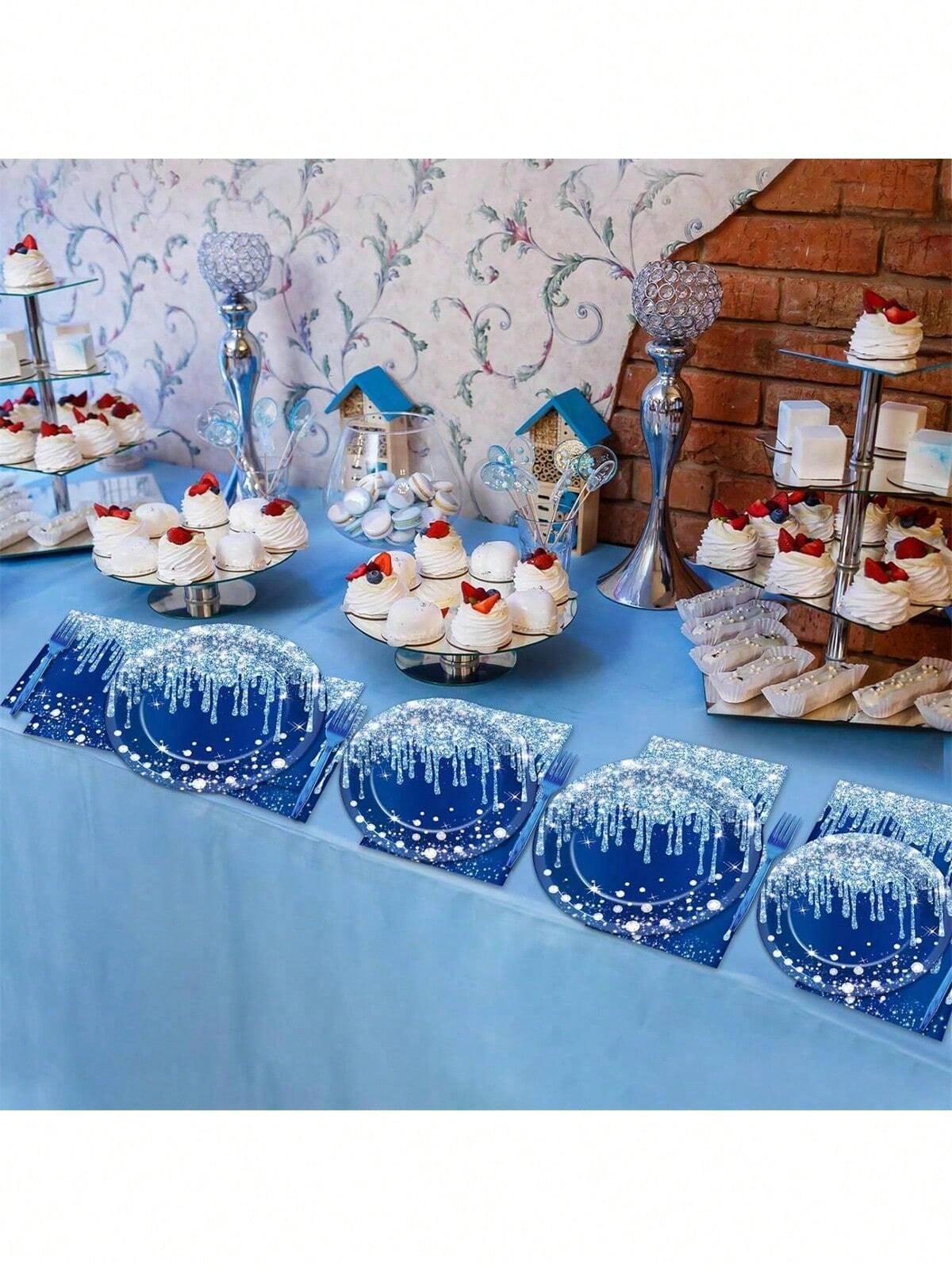 60Pcs Blue Silvery Tableware Set With 7'' And 9'' Dinner Dessert Plates Luncheon Napkins For Princess Silvery Glitter Happy Birthday Party Supplies Wedding Tea Party Anniversary Baby Shower Party Table Decorations