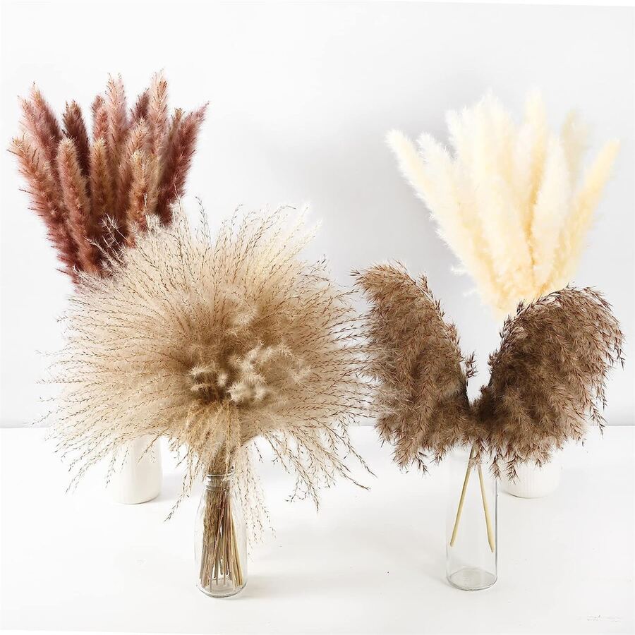 65pcs Dried Pampas Grass Decorations (15pcs Brown Pampas, 15pcs White Fluffy Grass, 33pcs Reed Grass, 2pcs Natural Decorative Feathers), Bohemian Wedding Party Bouquet (17.5 Inches)