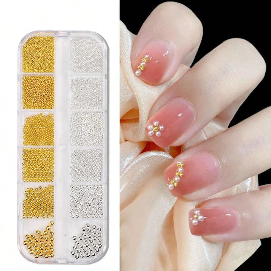 6Sizes 0.8-3.0mm Gold/Silver Nail Art Metal Round Beads 12Grids/Box Stainless Steel Ball Bead Micro Steel Ball Nail Studs Design