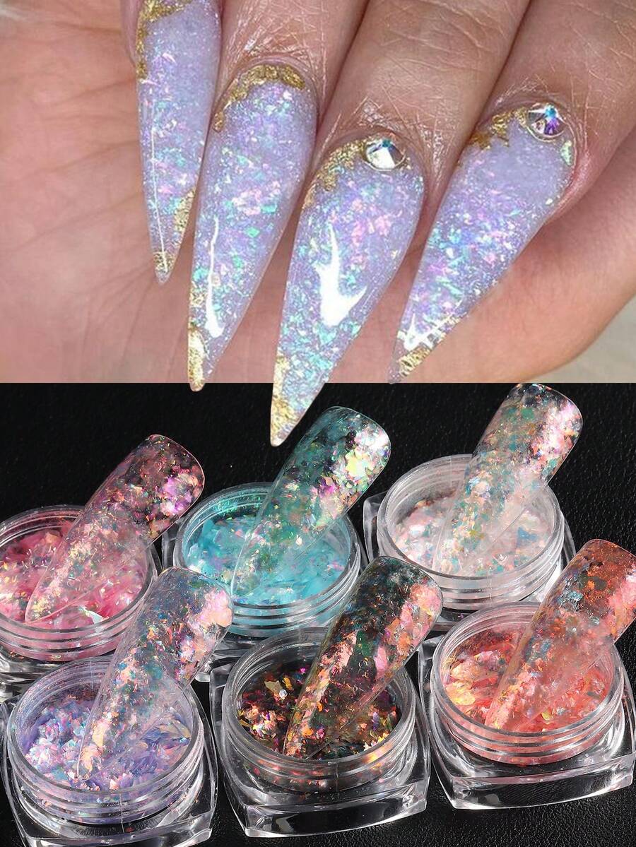 6boxs Iridescent Ice Crystal Opal Sequins Nails Flakes Holographic Sparkly Brocade Glitter Powder Colorful Glass Paper Pigments Charms Gel Polish Powder Make Up DIY Nail Decoration Manicure