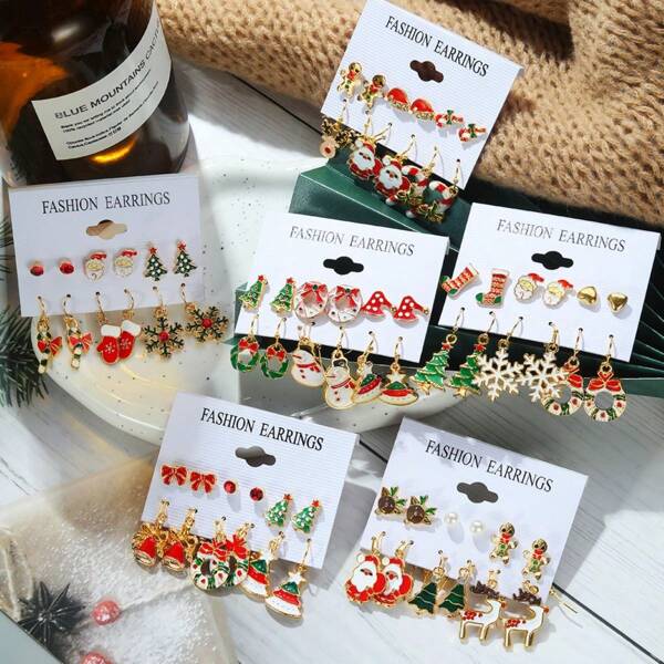 6pairs Cartoon Santa Claus & Reindeer Design Earrings For Women, Christmas Party Fashion Accessories Set