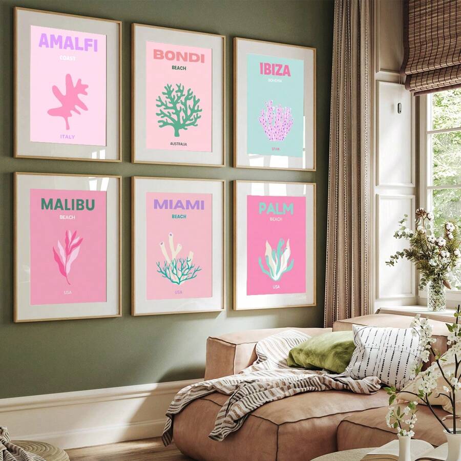 6pcs Beach Travel poster,Pink Preppy Coastal Prints,Artwork Wall Painting for Bar Cart Living Room Home Wall Decor ,NO Frame 11.8X15.7 Inch