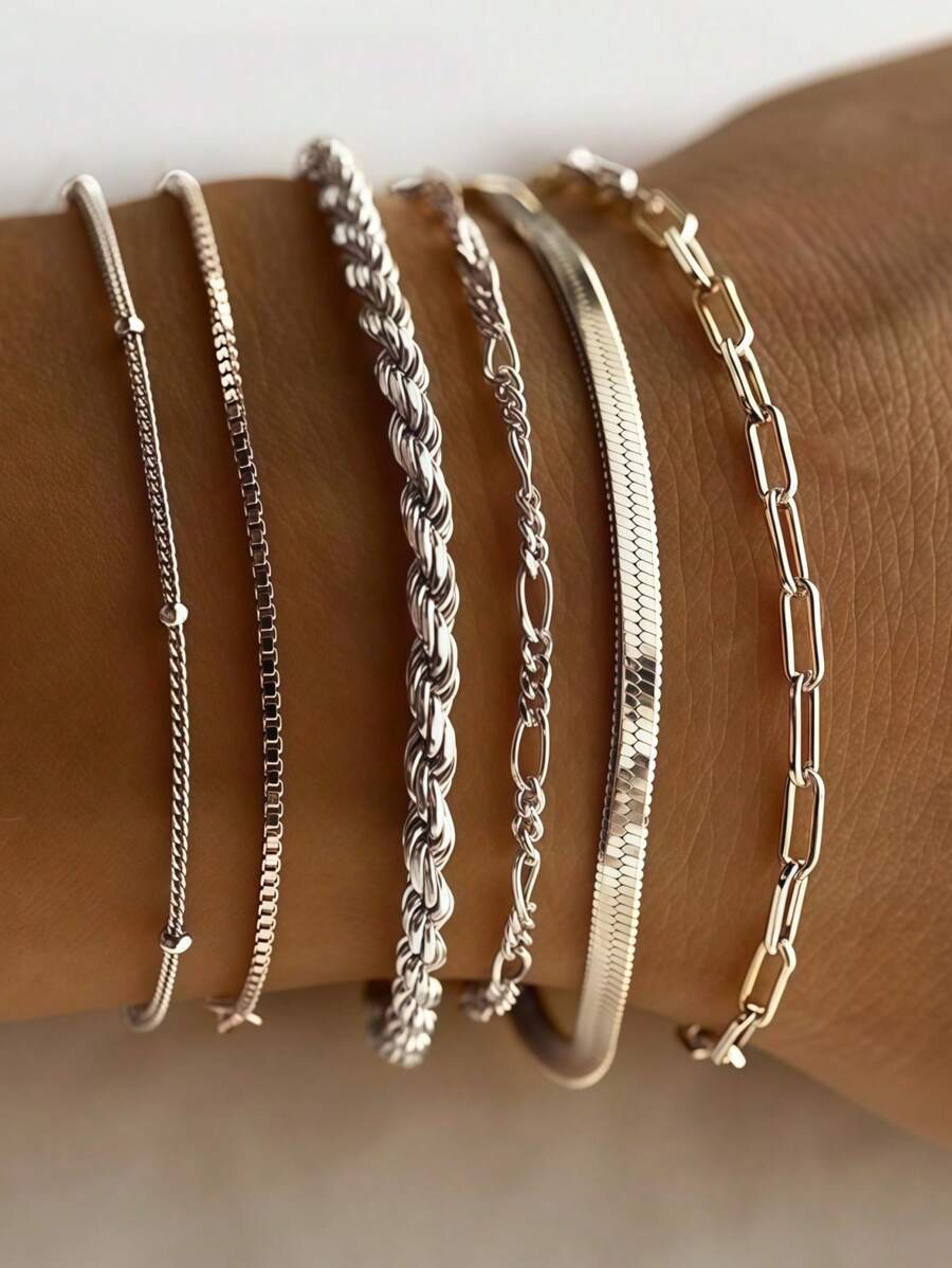 6pcs New Stainless Steel Waterproof & Fade-Resistant Braided Chain, Snake Chain, Bead Chain Bracelets, Versatile For Women's Daily, Party Wear, Beach Outfit, Gift