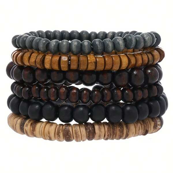6pcs/Set Men'S Vintage Style Multi-Layer Wooden Beaded Bracelet Holiday Party Accessories