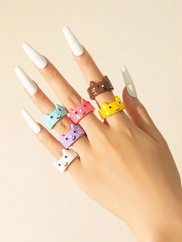 6pcs/set Colorful Cat Design Resin Ring Set