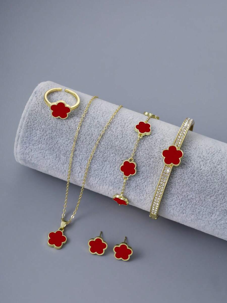 6pcs/set Micro Inlaid Zirconia Five-petal Flower Shaped Bracelet, Copper Necklace, Bracelet, Earrings, Ring Suite For Women, Perfect Gift For Dating, Wedding, Graduation Ceremony