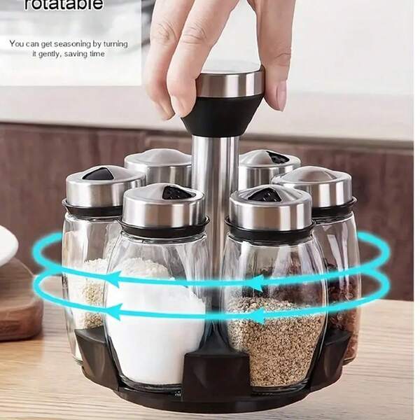 7-In-1 Tabletop Decoration Rotating Spice Jar Rack With 6 Pieces Of Spice Jars Set And Rotating Base, Kitchen Condiment Bottles Combination Set